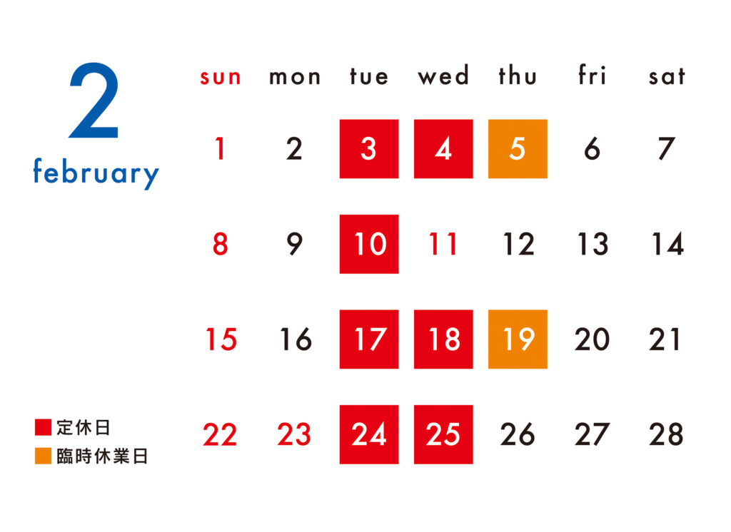 2月の定休日をご案内いたします。