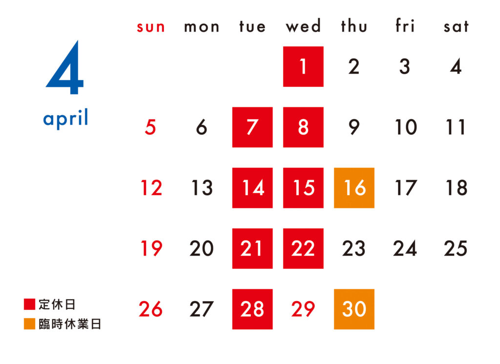 4月の定休日をご案内いたします。